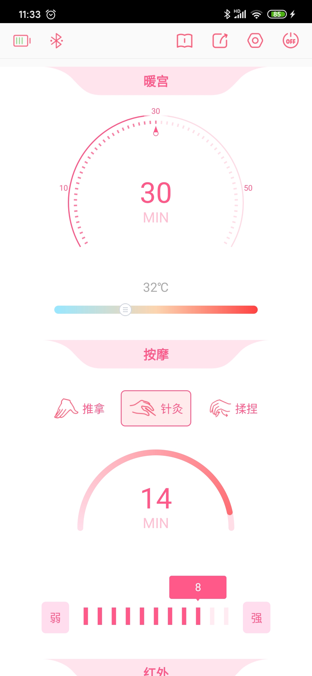 暖宫贴APP是一款专业的经期护理应用,APP与暖宫贴使用蓝牙连接,打开APP即可体验热敷、光疗、按摩三大功能,同时用户可根据自身喜好切换按摩模式,亦可依据自身痛经程度调节按摩力度,为您经期保驾护航,平稳度过。